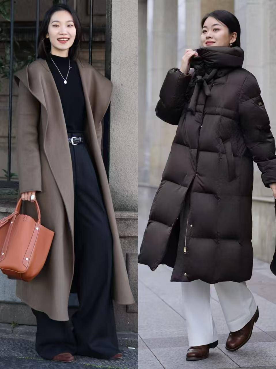 举例,上头成王人女生的街拍穿搭,用一件长款的羽绒服外衣搭配上牛仔阔腿裤,御寒娴雅又遮肉。