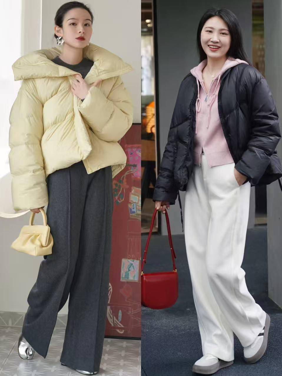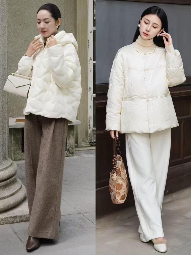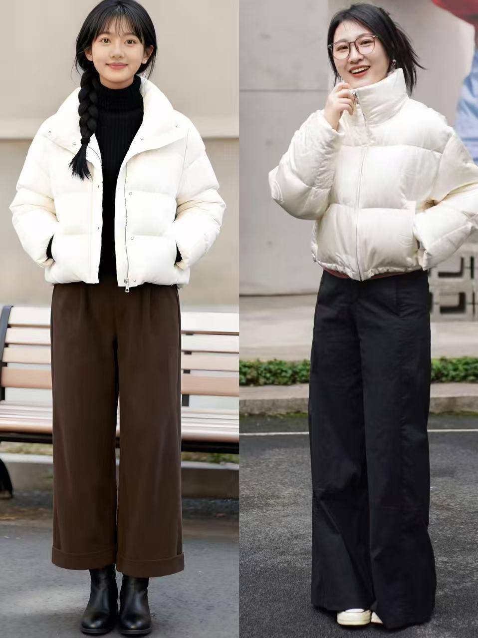 第四章节:短羽绒服与阔腿裤的精妙搭配,个子女生展现出高挑身姿①:白色羽绒服搭配阔腿裤