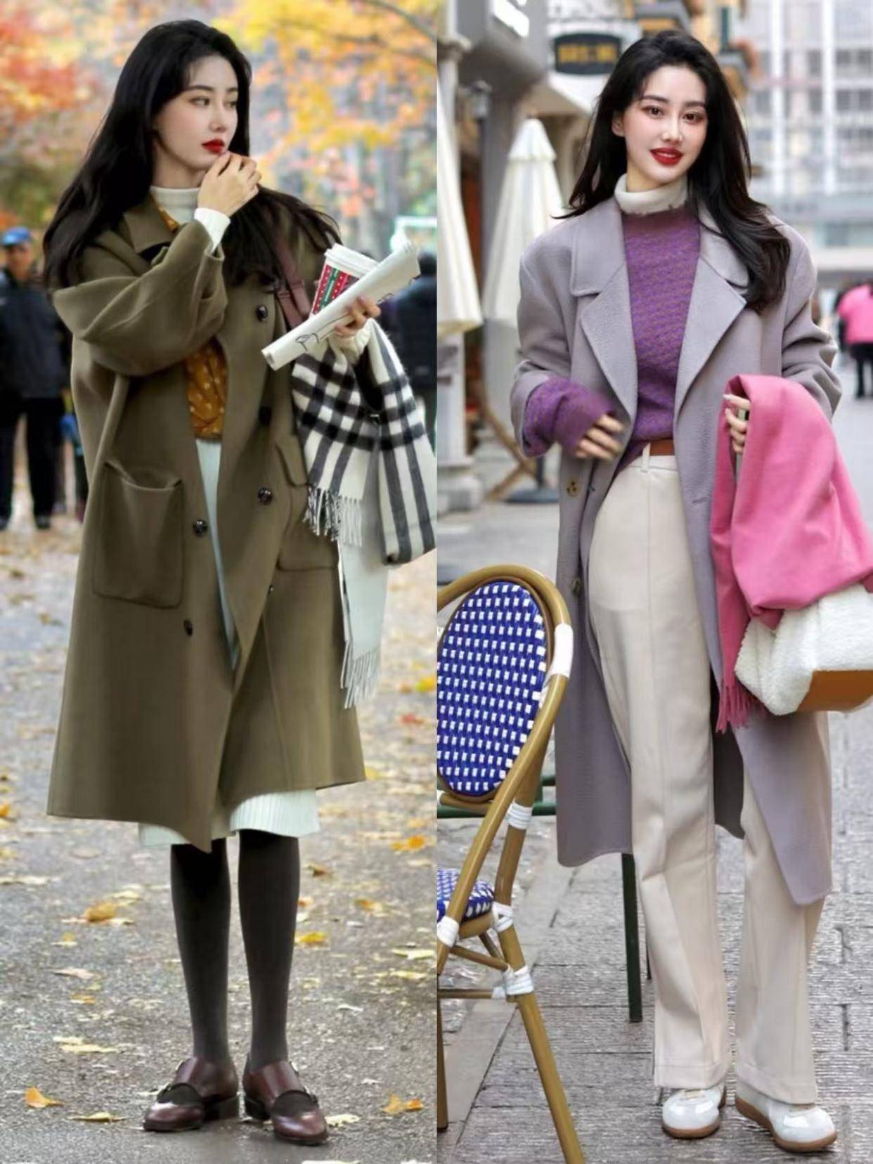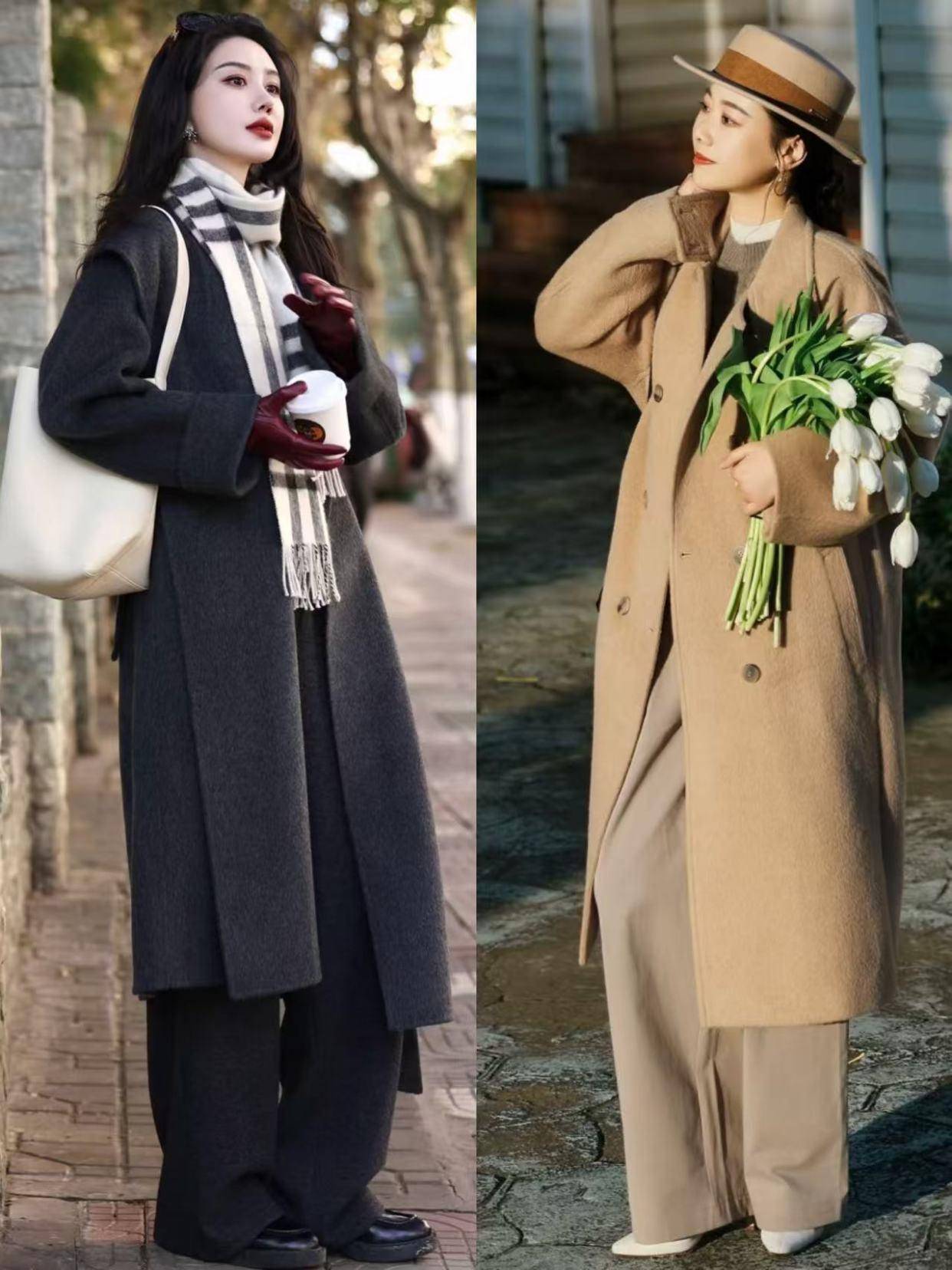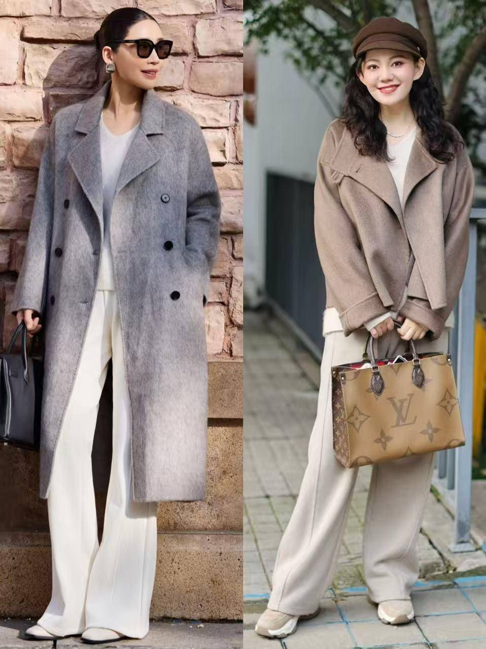 举例上头这2套穿搭,分辩是灰色大衣和驼色大衣,下半身径直聘请同色系的阔腿长裤来组合,就能让你的体魄线条变得极端畅达,同期秀丽风韵尽显。